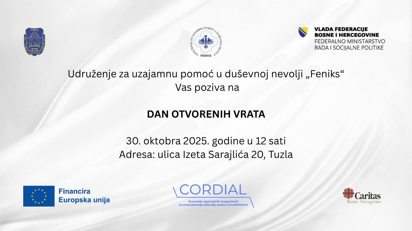 Udruženje za uzajamnu pomoć u duševnoj nevolji “Feniks” s radošću poziva sve zainteresirane na Dan otvorenih vrata, koji će se održati u četvrtak, 30. oktobra, s početkom u 12:00 sati, u prostorijama Udruženja na adresi ulica Izeta Sarajlića 20, Tuzla.